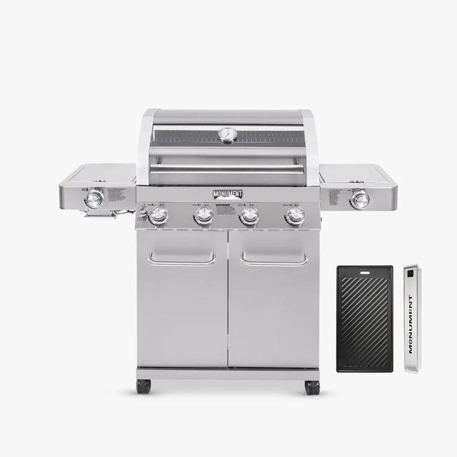 Embark on your grilling journey with our stainless steel 4-burner gas grill, featuring a side burner and sear zone, offering robust performance and innovative features: